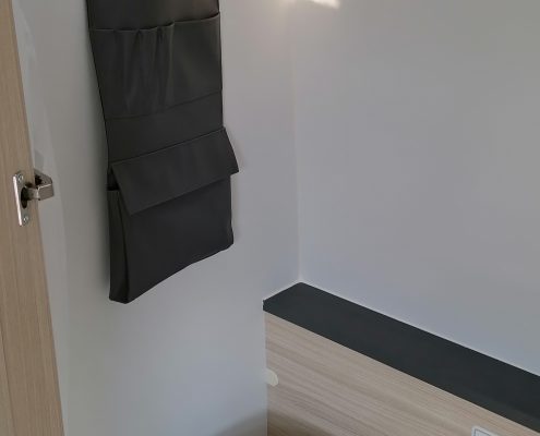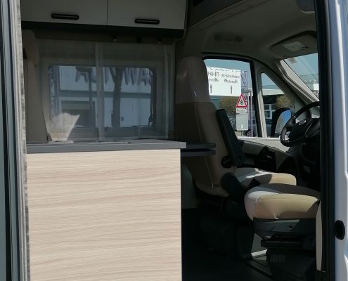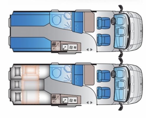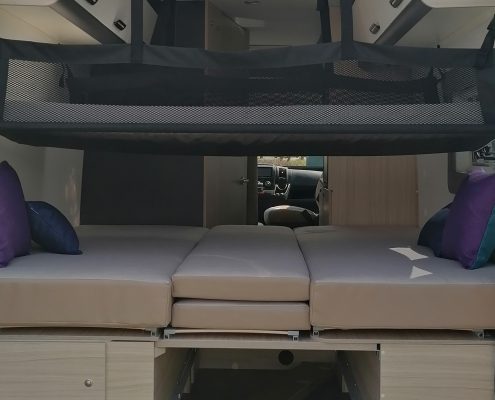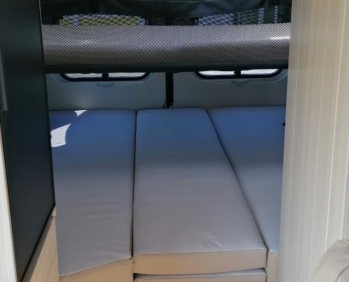 Das knapp 6,4 Meter lange Wohnmobil verfügt über zwei Längsbetten, die tagsüber zum Sofa umgebaut werden können. Mit einem Mittelteil können die Längsbetten zu einem Doppelbett oder als zusätzliche Schlafmöglichkeit für Kinder ergänzt werden. Als weitere Schlafmöglichkeit kann ein Einhängebett über den Längsbetten montiert und genutzt werden. Somit bietet das Reisemobil platzt für vier Personen.